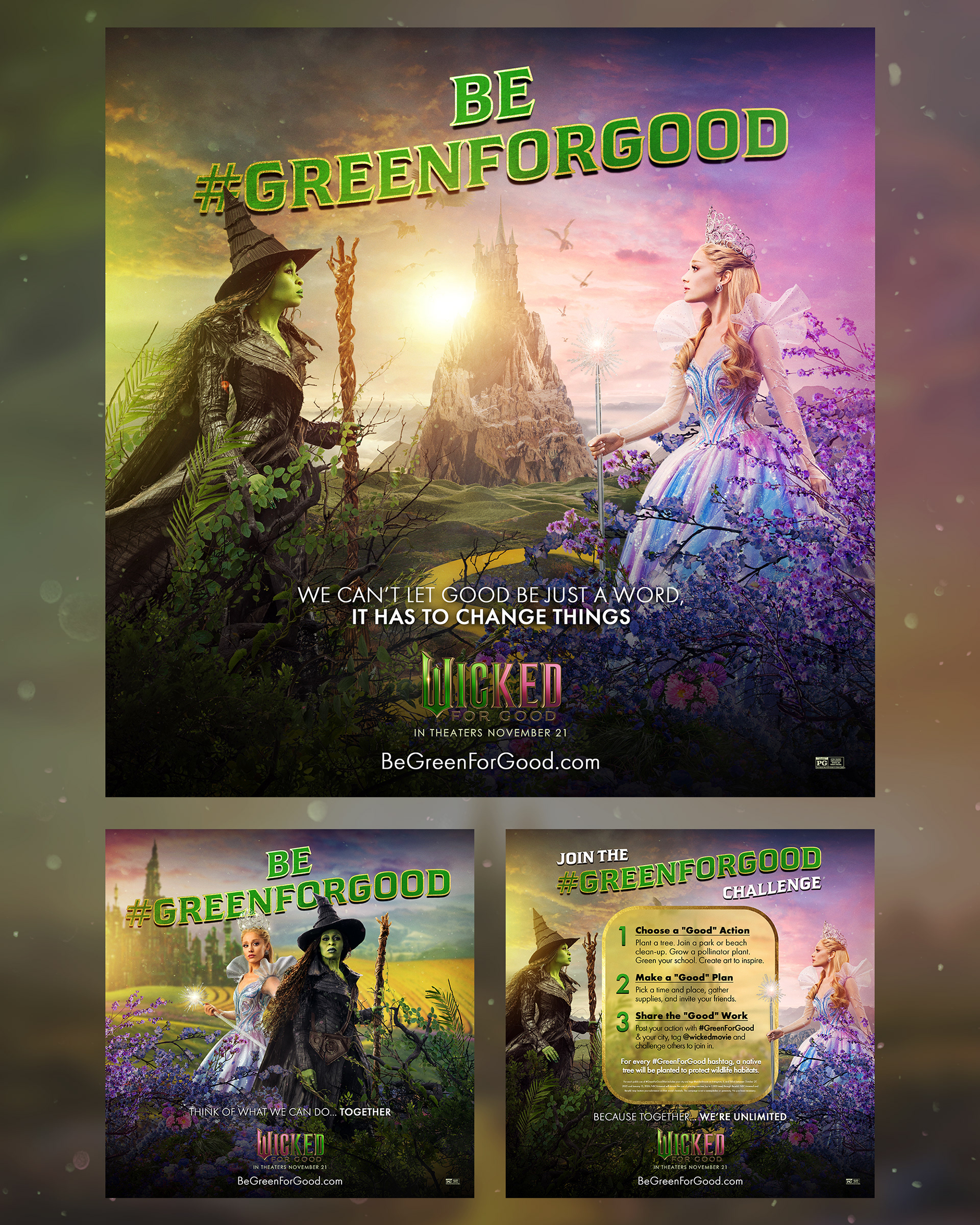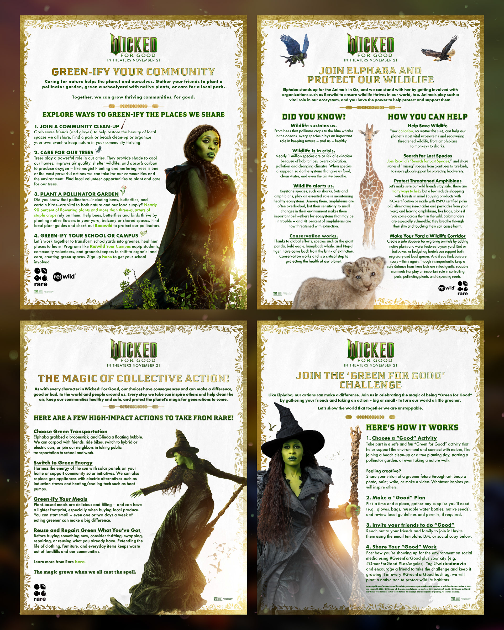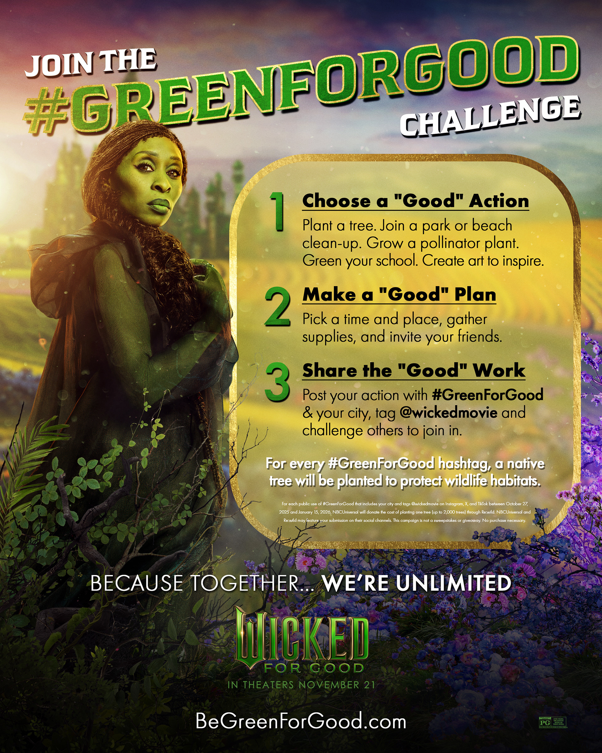 The themes in Wicked: For Good remind us that we can all have the courage to stand up for what we believe in and to do real good in the world. Being Green for Good means carrying Elphaba’s spirit into our own lives – taking everyday steps to support nature and our communities.